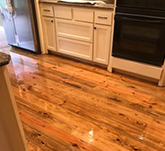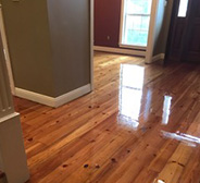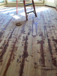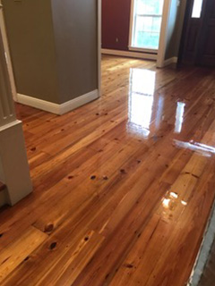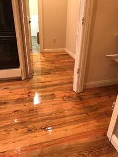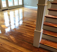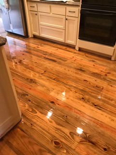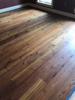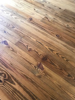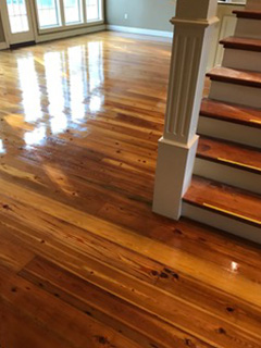 This was a custom stain job so it required a lot more sanding than a regular natural floor. This job took about 3 weeks to complete but in the end to see the smile on the owner’s face was worth all the effort!!! The other challenge was that the house originally had antique heart pine floors that the contractor was supposed to match.